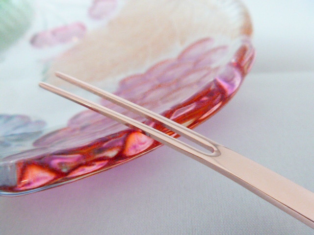 カトラリー「URBAN」ピックフォークの刃は二つ又です。全体的に刃の部分を見るとウエストのように先端・根元よりも中間が若干細くなっております。